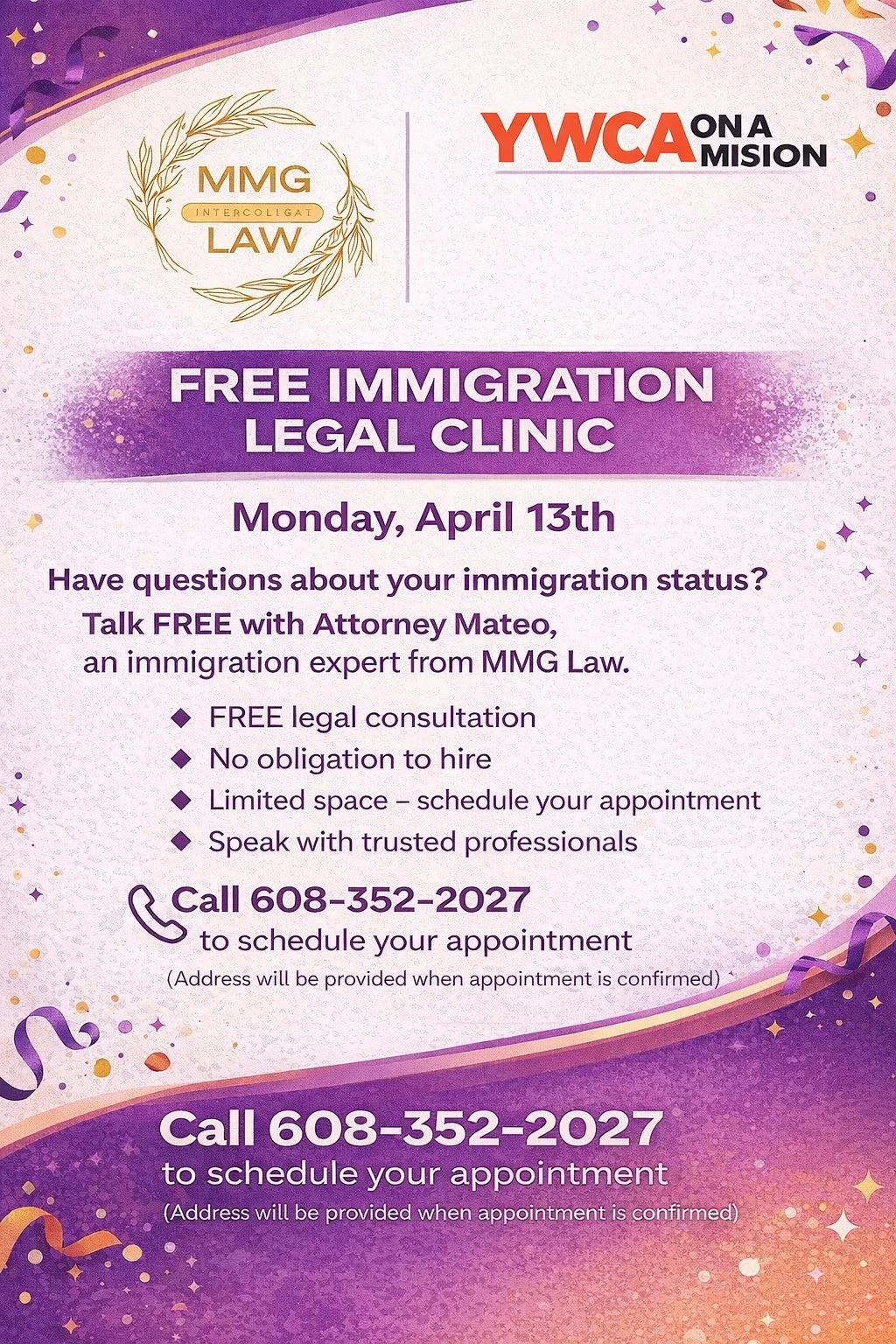 Free Immigration Legal Clinic! Registration opens on June 1st. Do you have questions about your immigration status? Join us for a free legal consultation with a trusted immigration attorney. Knowing your rights is the first step toward protecting your future. Please share with anyone who may benefit.